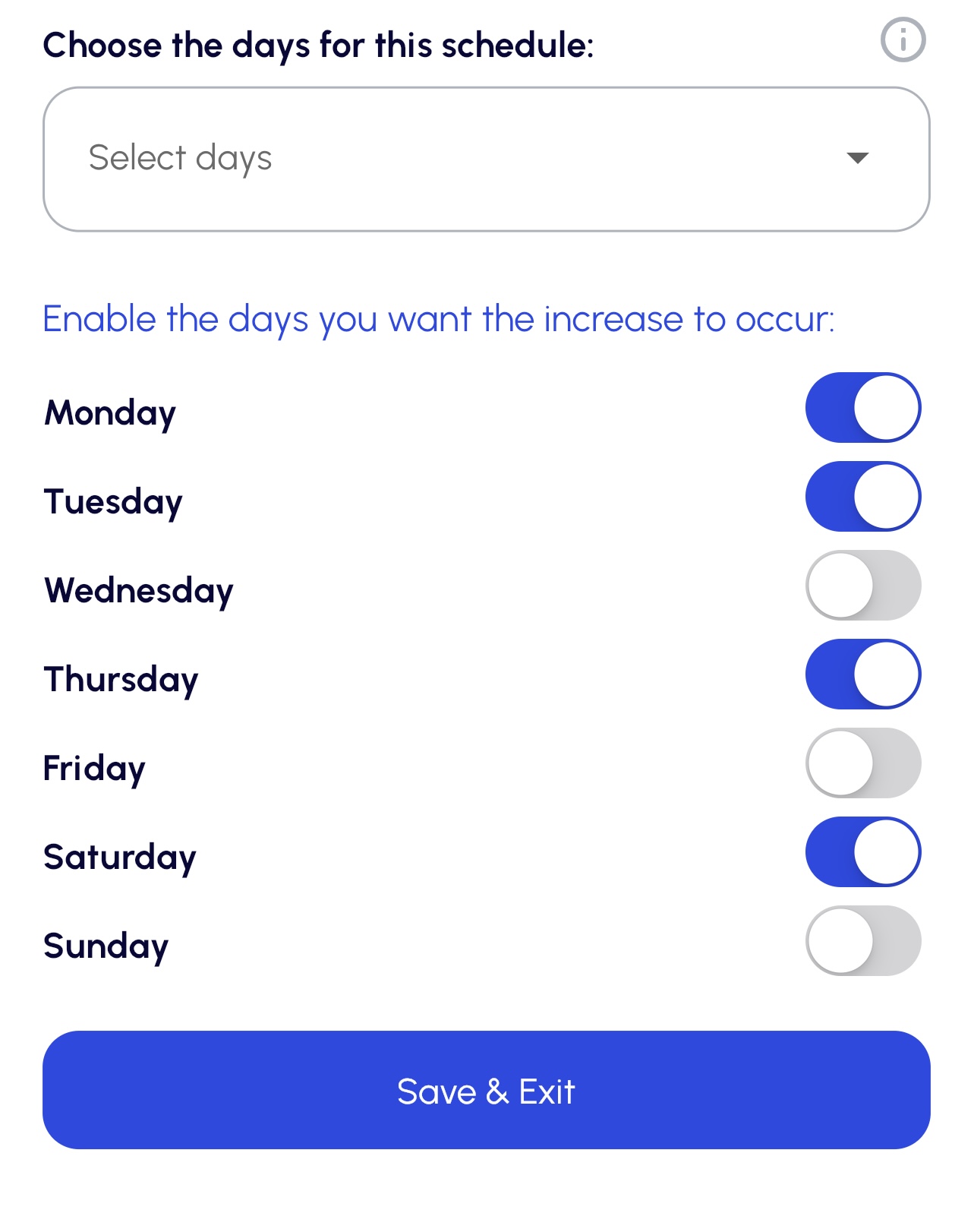 | 1. Turn on Advanced Settings and set a start and end time. | 2. Select your days for the timed increase to occur. | 3. You can choose any combination of days for your schedule. |
